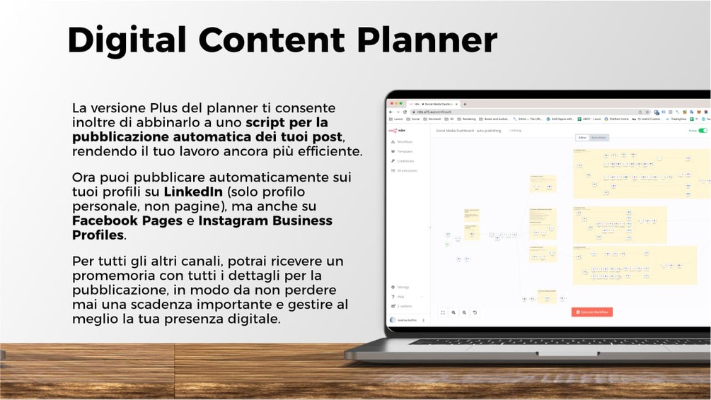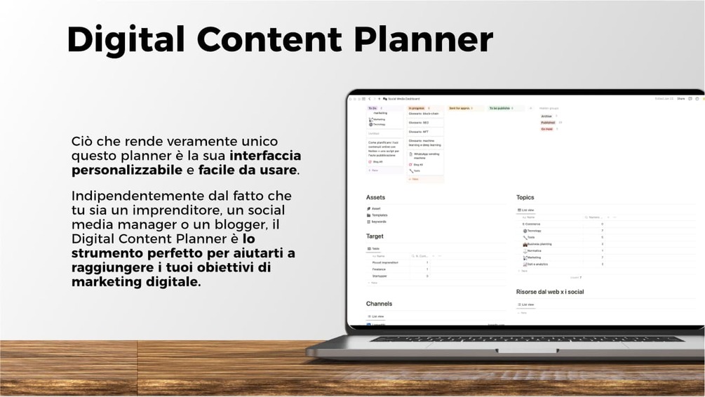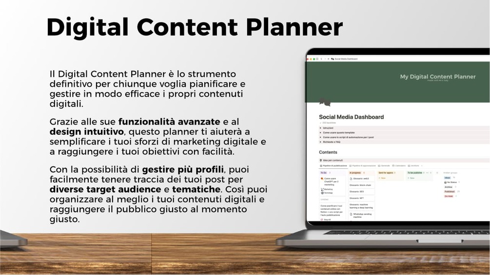 Il Digital Content Planner rappresenta l'opzione ideale per coloro che desiderano una pianificazione e una gestione efficace della propria presenza digitale. Grazie alle sue avanzate funzionalità e al design intuitivo, questo strumento ti consentirà di massimizzare i tuoi sforzi di marketing digitale e di raggiungere i tuoi obiettivi con facilità.